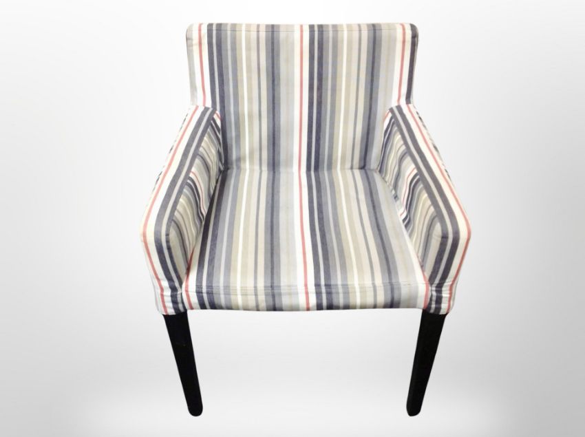 A contemporary armchair in striped upholstery