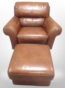 A contemporary brown leather stitched armchair with matching footstool