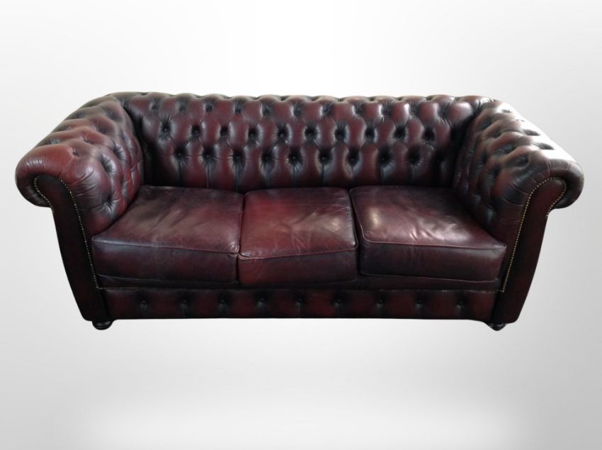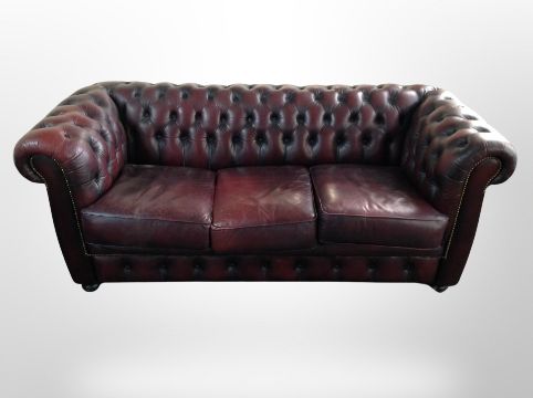 A Chesterfield oxblood buttoned leather three seater settee, length 196 cm