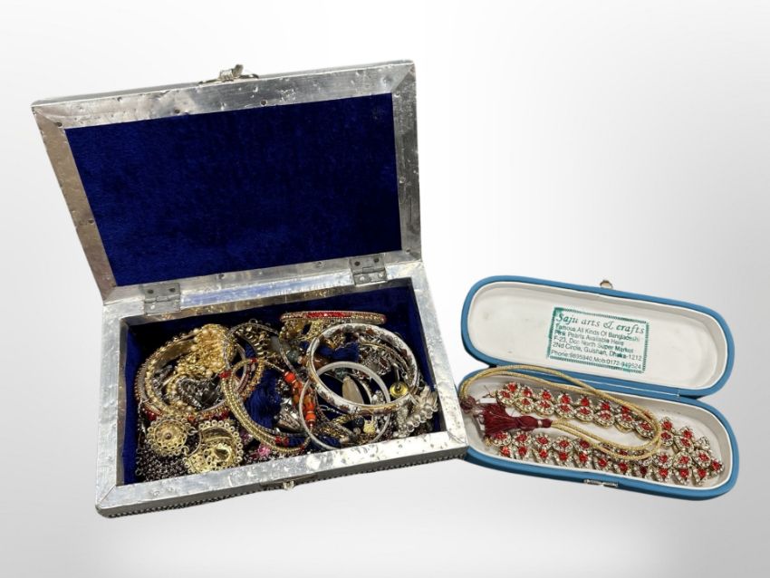 A decorative eastern jewellery box containing costume necklaces, bangles, dress ring etc