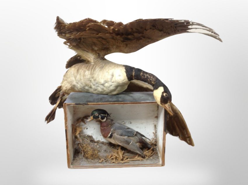 A taxidermy Canada goose and Mallard duck in display box (af)