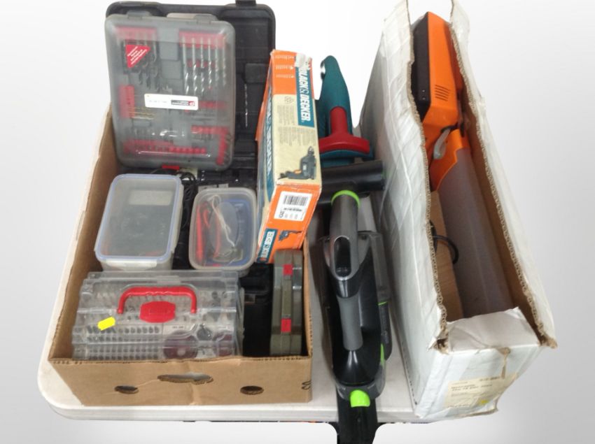 A box of Black and Decker drill, performance drill bits, volt meter, Bosch hedge trimmer, G-tech hand held vac etc