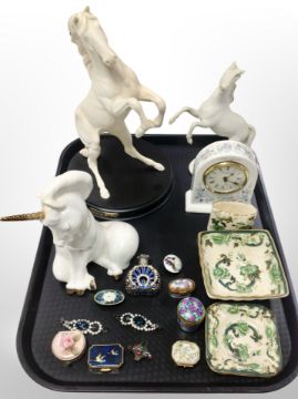 A Royal Doulton figure - Rearing horse 'Spirit of the wild' together with a similar figure, Wedgwood porcelain clock, three pieces of Masons Chartreuse china, several miniature trinket boxes etc