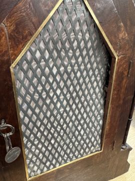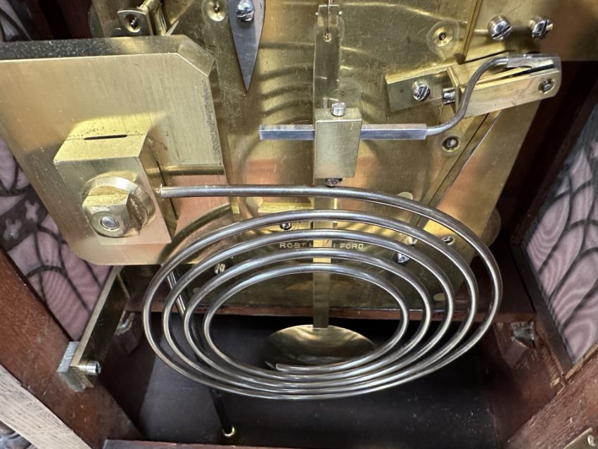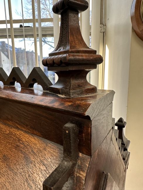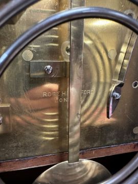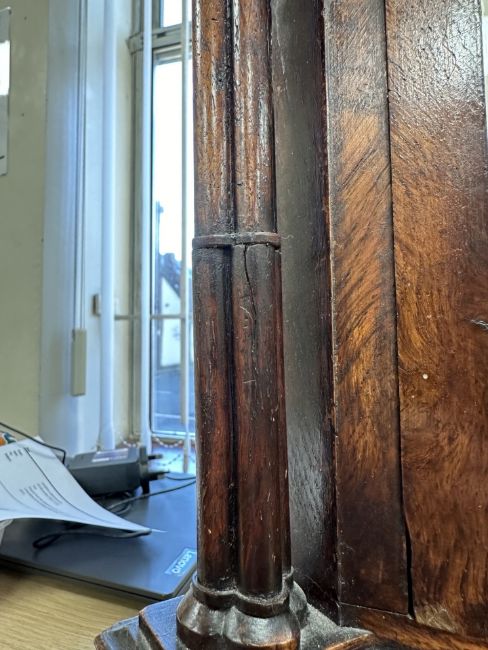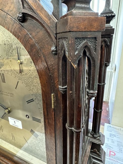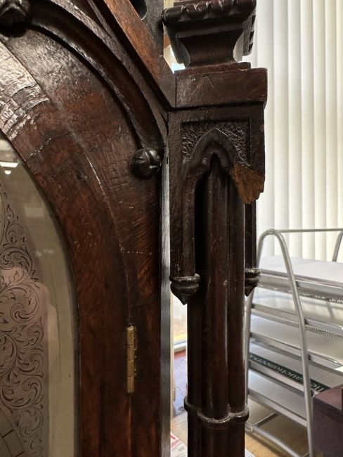 There are two breaks to the Gothic hanging columns found on each corner of the upper case. One of these losses is to the front-right group of columns, the other is to the back-left. Each of the broken pieces is present and could be restored. The front door is in good order with a working key. The dial is quite clean, all the steel hands are in good order and look to be modern replacements. All dial engraving, numerals, signature etc are in good order. There is a visible repair to part of the stepped carving on the upper-left of the clock case at the front. The spire at the back of the centre of the case has a chipped base. The metal and fabric cover of the back door is bent inwards slightly but is otherwise stable. The movement appears clean. Mechanically the clock seems to be in very good order. It winds very smoothly and strikes without issues on the hour and each quarter. The chime/silent, speed regulation and the chime on 8 bells/chime on 4 bells adjustments all seem to be working correctly. The clock strikes with a good tone on the gong and all hammers are striking the bell correctly.