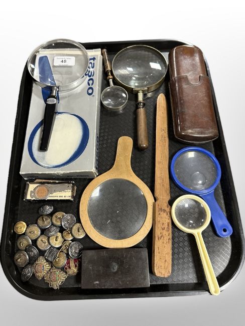 A group of magnifying glasses, military buttons, Bakelite snuff box, leather cigar case etc