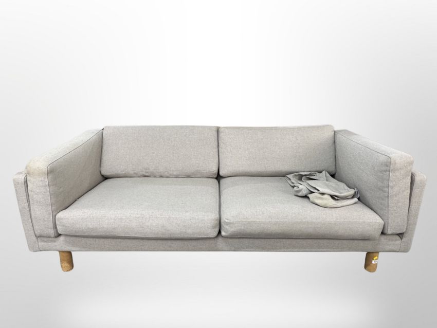 A late 20th century Danish three seater settee in grey fabric, length 208 cm