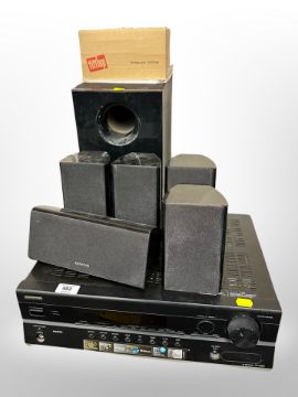 An Onkyo AV receiver HT-R380 and six assorted speakers with leads