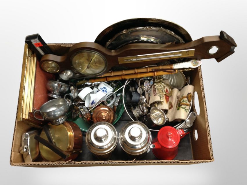 A box of stainless steel storage jars, silver plated salvers, enamelled coffee pot, contemporary barometer, hip flask etc