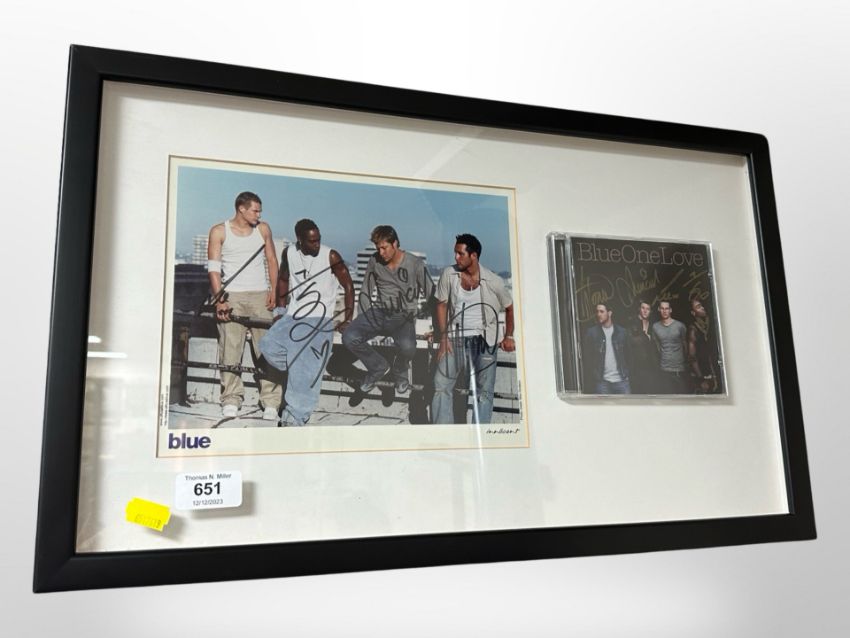 A Blue One Love CD and accompanying photograph, each signed by the band, framed, 54 cm x 33 cm
