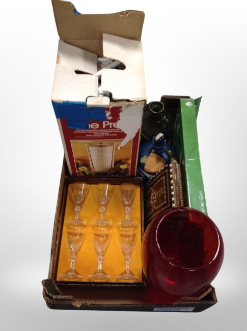 A box of wine press, six crystal glasses, parquetry inlaid box, sealed decanter of Lamb's Navy Rum etc