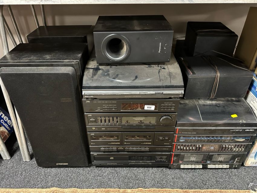 A Philips semi automatic turntable, four JVC hifi separates, Bush turntable, several pairs of speakers etc