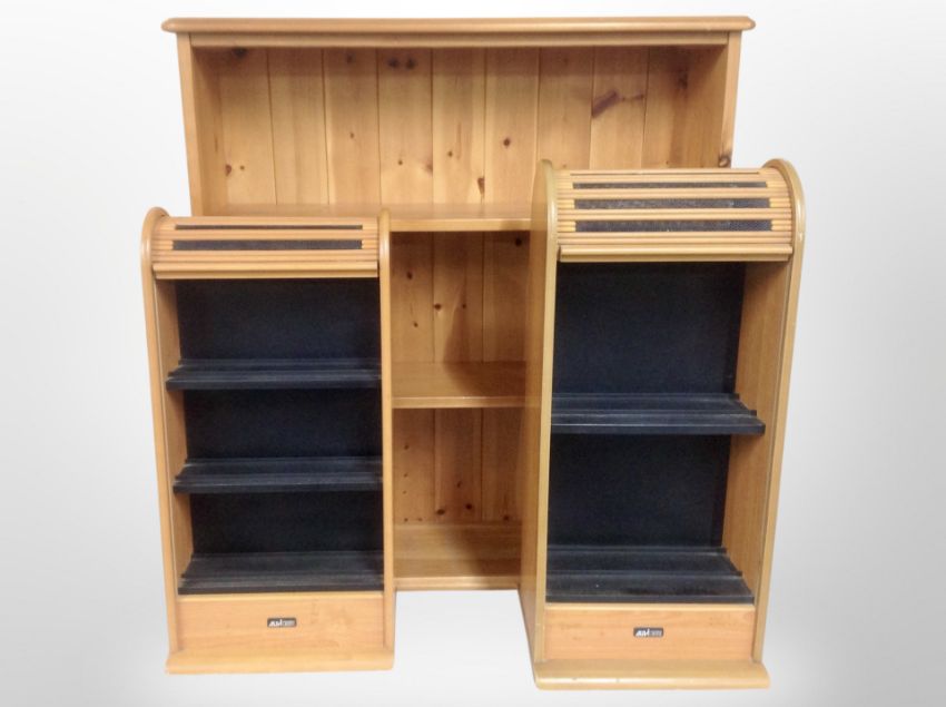 A contemporary pine open bookcase, width 84 cm together with two shutter fronted storage cabinets and a contemporary lamp table (4)