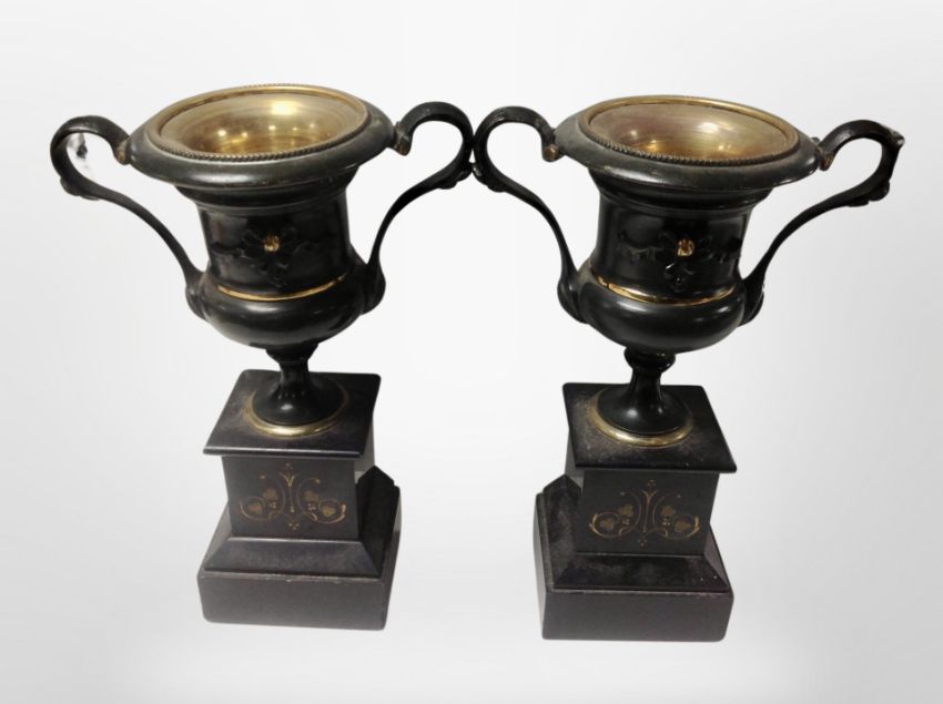 A pair of patinated metal urns on marble plinths, height 27 cm