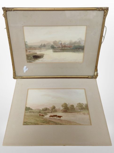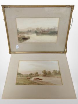 Two enamelled milk jugs, height 36 cm, together with two antiquarian watercolours