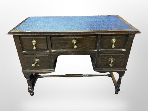 A late Victorian five drawer desk with blue leather inset panel, width 106 cm