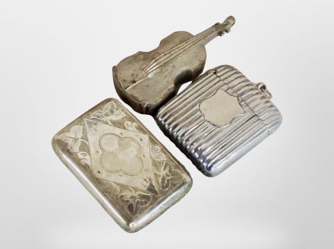 Three silver plated match vestas, one in the form of a cello