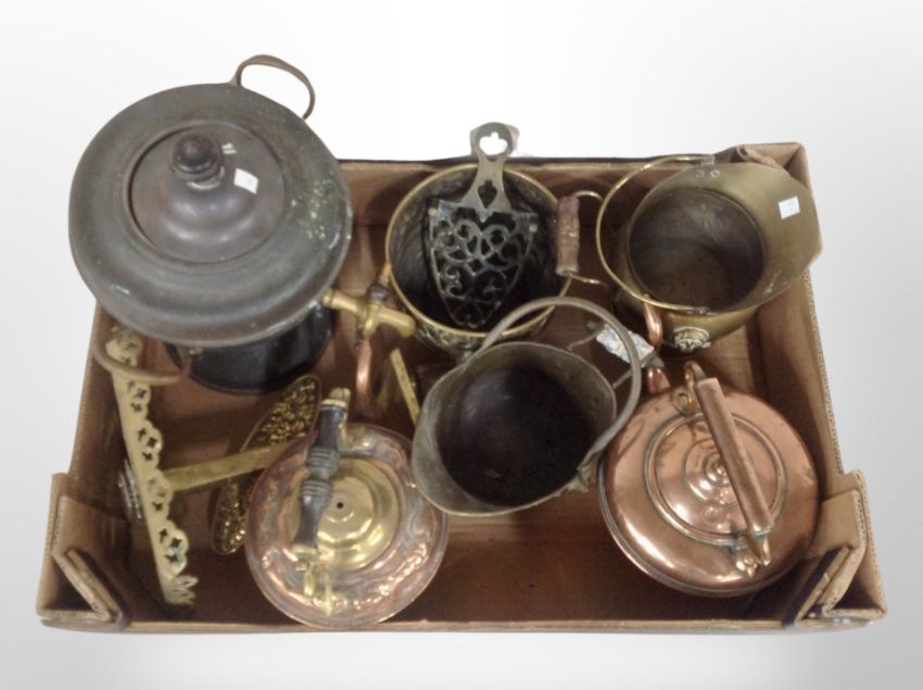 A box of 19th century brass and copper wares, kettles, samovar etc