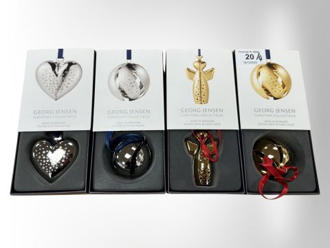 Four Georg Jensen Christmas Collectibles designed by Alfredo Haberli, 2017, (strung tree decorations), two plated with 18 carat gold and two plated with palladium, in original presentation boxes. (4)