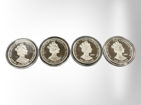 Two silver proof Golden Jubilee $10 coins, Henry III and Elizabeth II, together with two 50p silver proof coins, Henry VII and Charles II. (4)