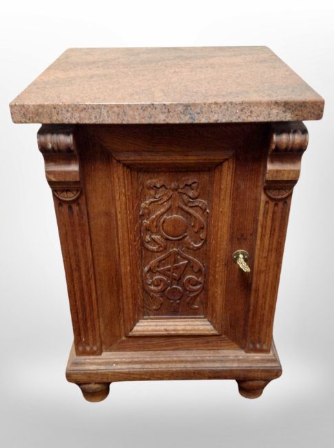 A 19th century carved oak pot cupboard with later granite top, width 43 cm