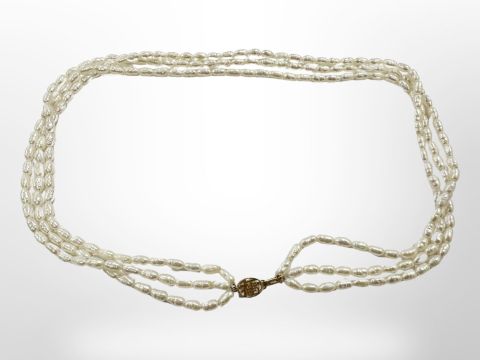 A triple strand cultured pearl necklace on 14ct yellow gold clasp, length 48 cm