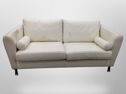 A contemporary cream leather two seater settee on metal legs with bolster cushions, length 182 cm
