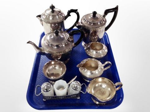 A four piece tea service together with three piece service and further stainless steel cruet