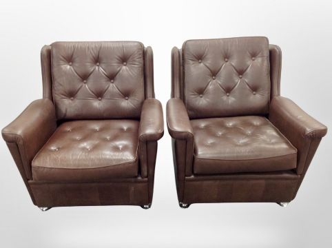 A late 20th century Danish brown buttoned leather three piece suite comprising of three seater settee, length 181 cm, and pair of matching armchairs