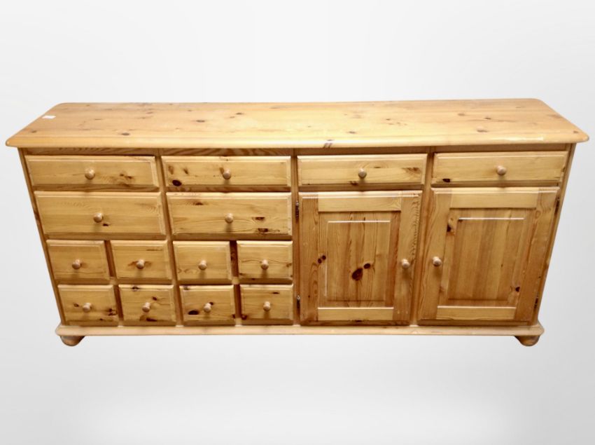 A pine sideboard fitted with fourteen drawers and cupboard, length 181 cm