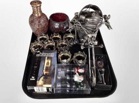 A metal bottle holder in the form of a motorbike together with a set of metal napkin rings, bottle stoppers, boxed wine breather, glass bottle and matching bowl etc