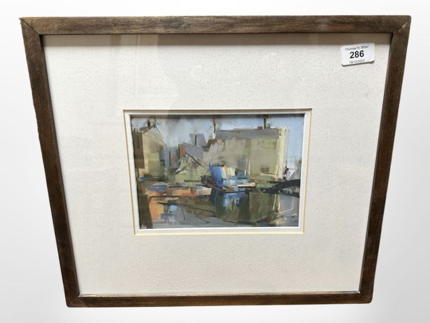 David Greenwood (20th Century) : Canal Tug-Boat, pastel, signed, dated '97, 15 cm x 21 cm, label verso, framed.