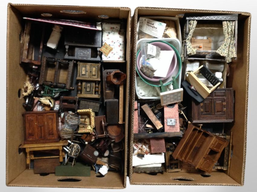 Two boxes of doll's house furniture, Persian rugs, beds, Windsor chairs, period oak cupboards and dressers etc