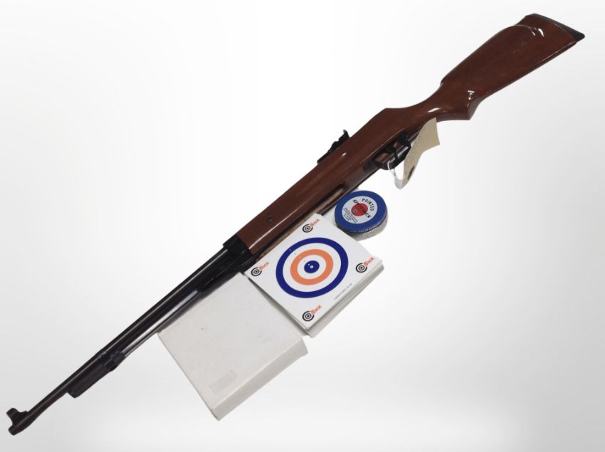 A BAM .22 calibre air rifle, tin of pellets and a quantity of paper targets