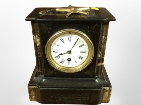 A Victorian black slate and marble mantel clock, height 23 cm
