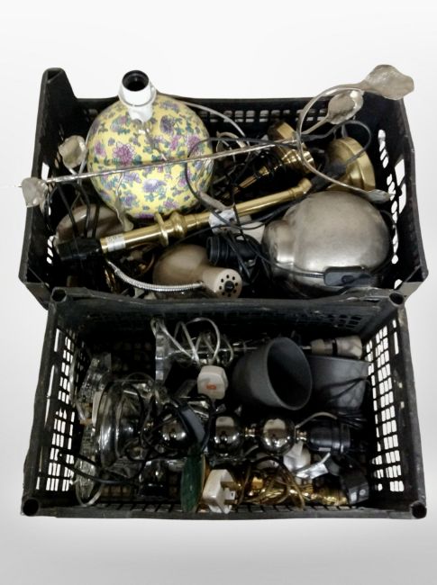 Two crates of assorted lamp bases, Chinese style porcelain example etc