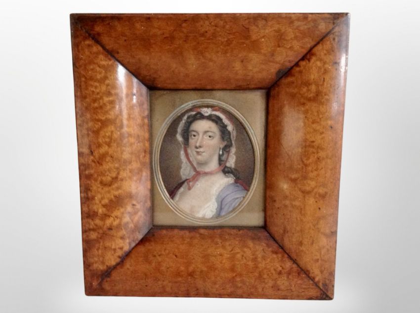 English School (early 19th century) : Head and shoulder portrait of a lady wearing a bonnet, 7.5 cm x 6.5 cm (oval), in burr walnut frame