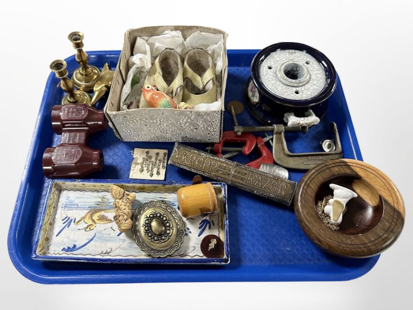 A tray of collectables, cut throat razor, bakelite binoculars, vintage child's shoes, brass candlesticks, clamps etc