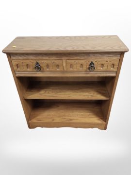 A contemporary oak effect low bookcase fitted with drawers, width 73 cm