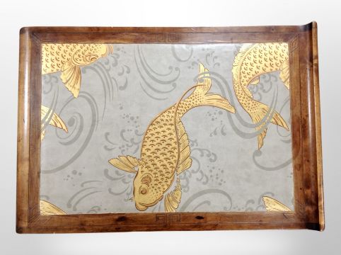 A 19th century Chinese carved hardwood low altar table fitted with two drawers, the top later decorated with Koi fish, length 84 cm