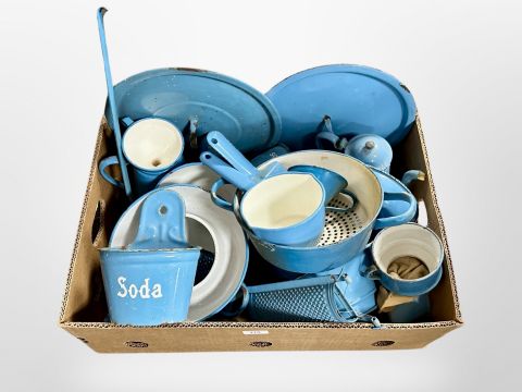 A box of early 20th century Danish enamelled kitchen wares including pots, pans etc