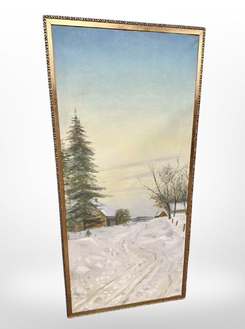 Danish School : Rural homestead in winter, oil on canvas, 120 cm x 55 cm