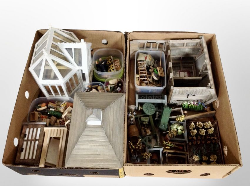 Two boxes of doll's conservatory, gazebo, garden shed, vegetable garden, garden furniture etc