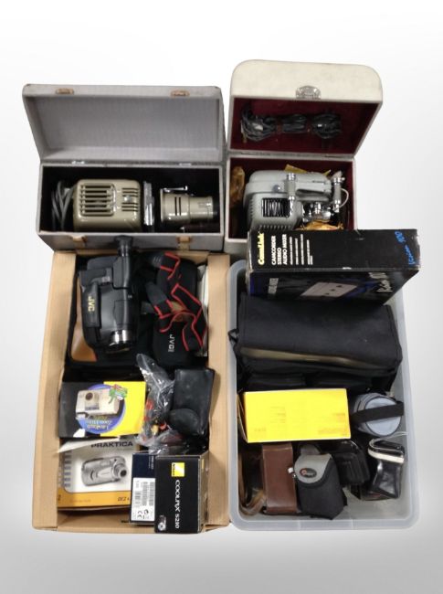 Two boxes of vintage and later cameras, digital cameras, JVC video camera, Elmo projector in box and one other