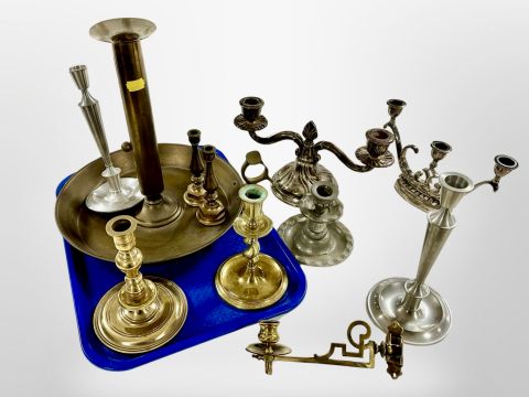 A large brass chamber stick, small pair of brass candlesticks, table candelabra etc