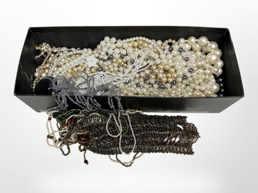 Three boxes of costume jewellery, faux pearls, flapper necklace etc