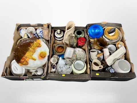 Three boxes of 20th century Scandinavian ceramics, vases, Steins, fruit bowls, figures etc