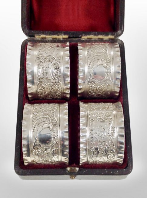 A boxed set of silver napkin rings