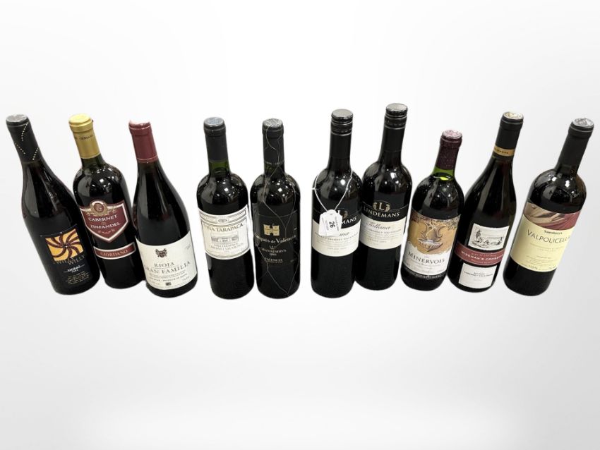 Ten bottles of red wine - Lindemans Tollana, Minervois 2000, Marques de Valencia 2001, Rioja Gran Familla etc.