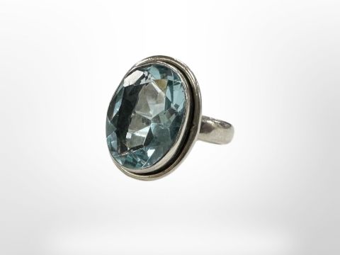 A Sterling silver dress ring set with aquamarine style stone, size L.