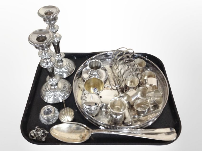 A silver plated gallery serving tray, napkin rings, toast rack, pair of candlesticks, pair of basting spoons